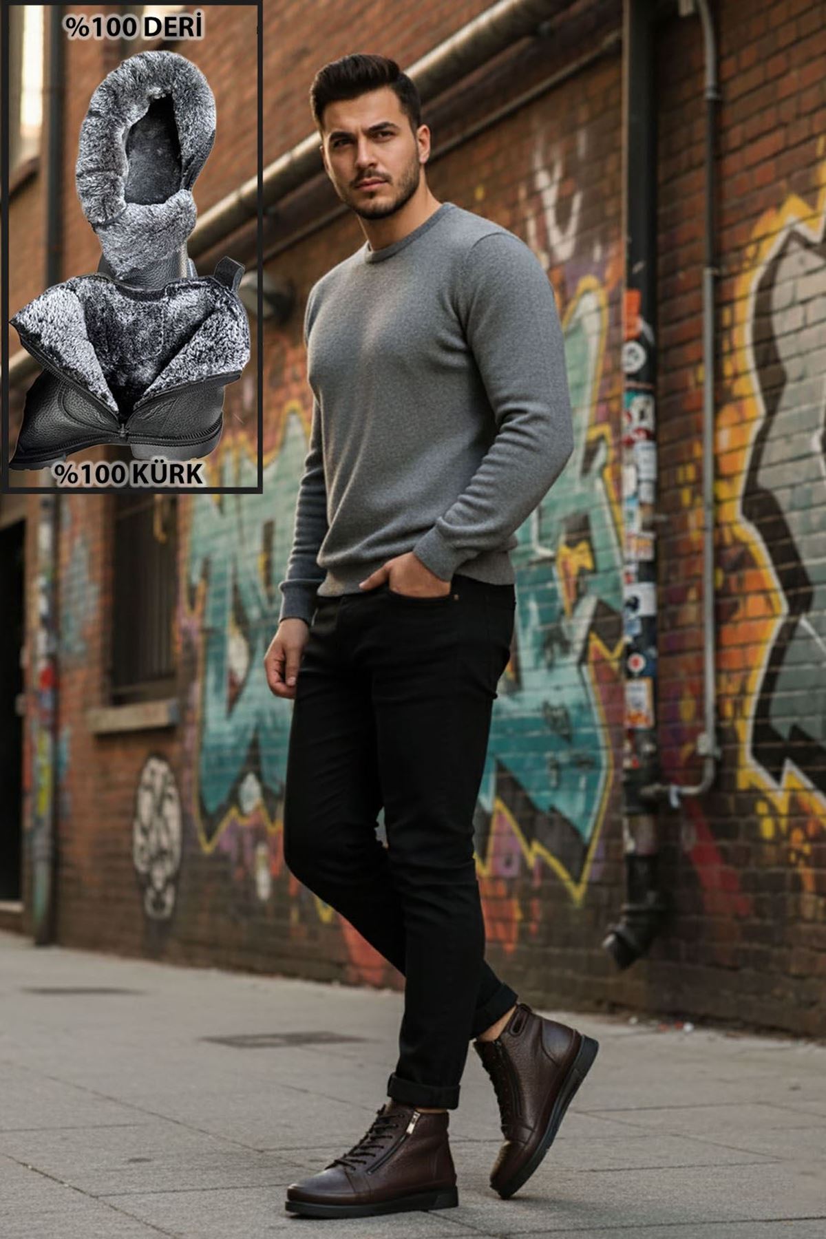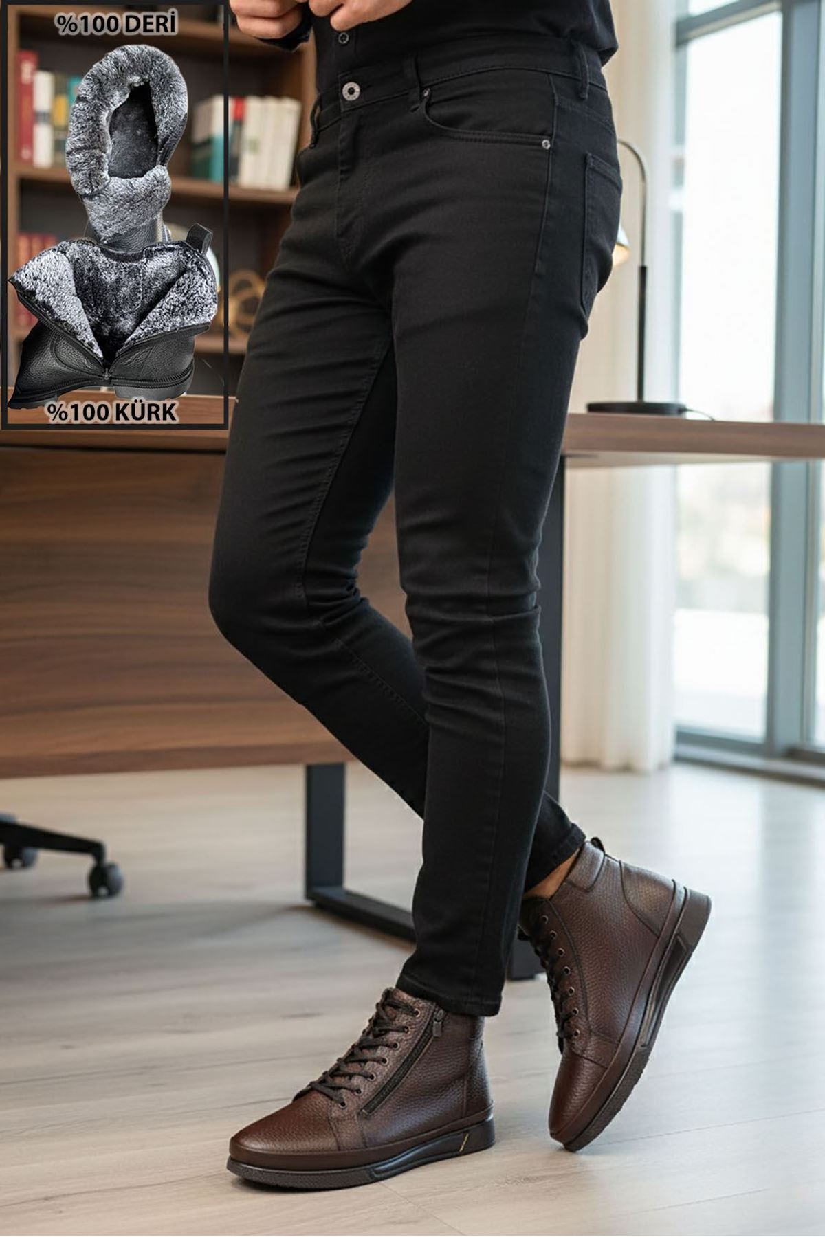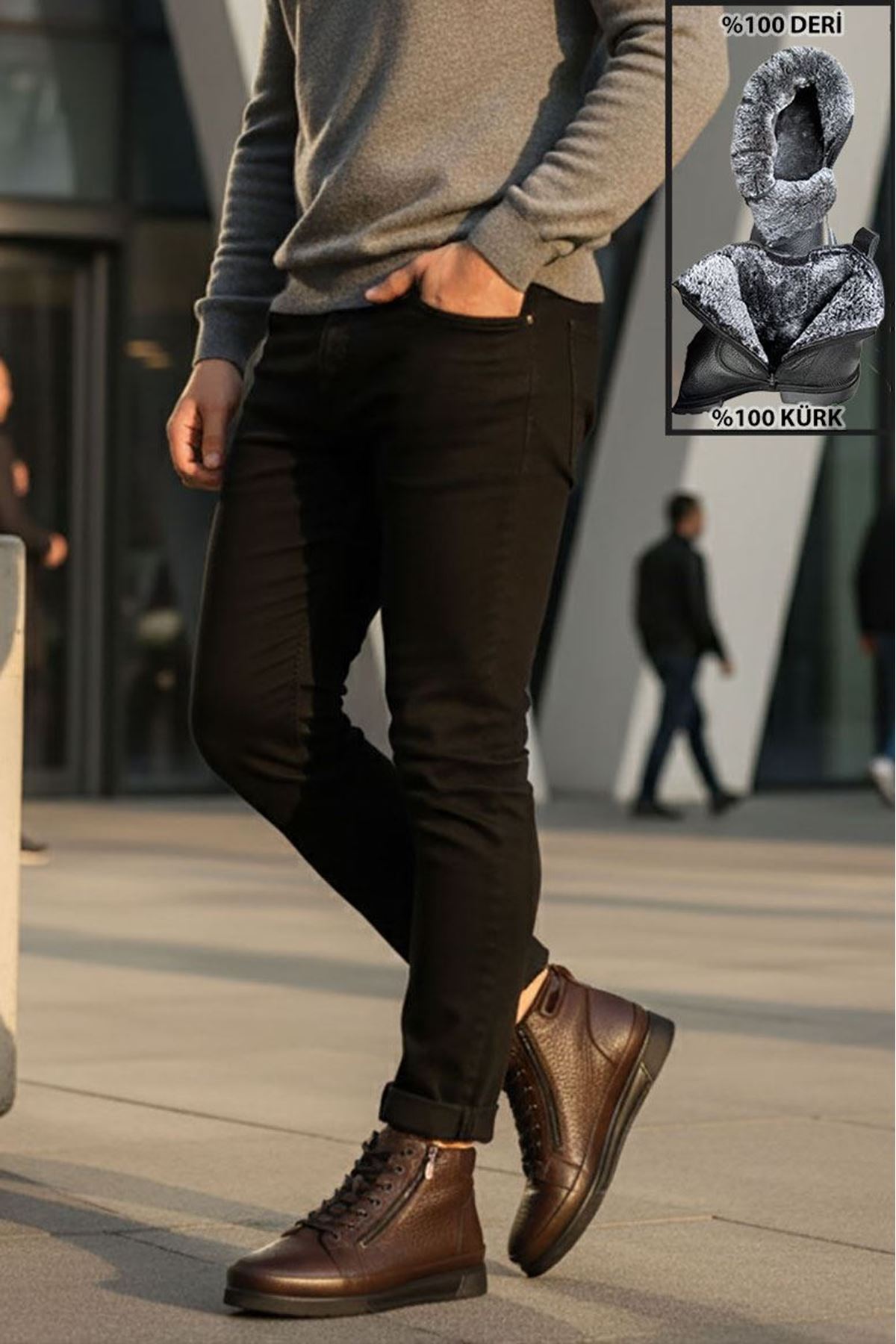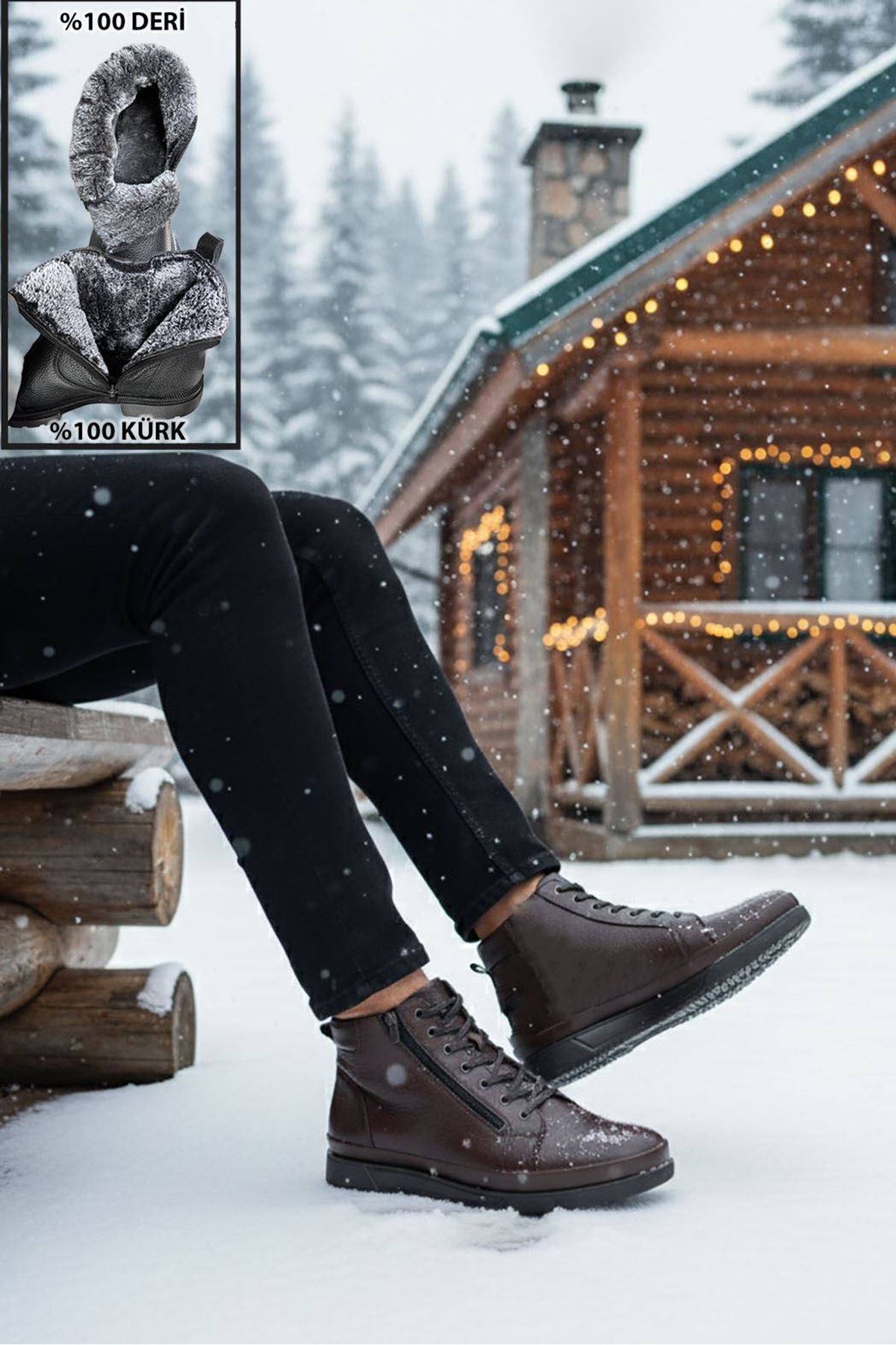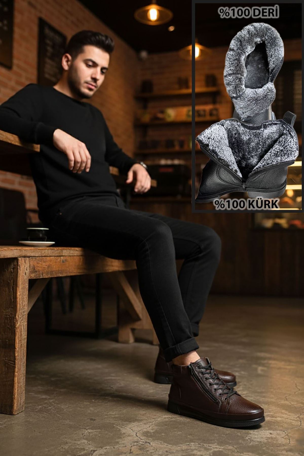 Boy Uzatan Gizli Topuk Kahve Fermuarlı İçi Kürklü Hakiki Deri Erkek Bot