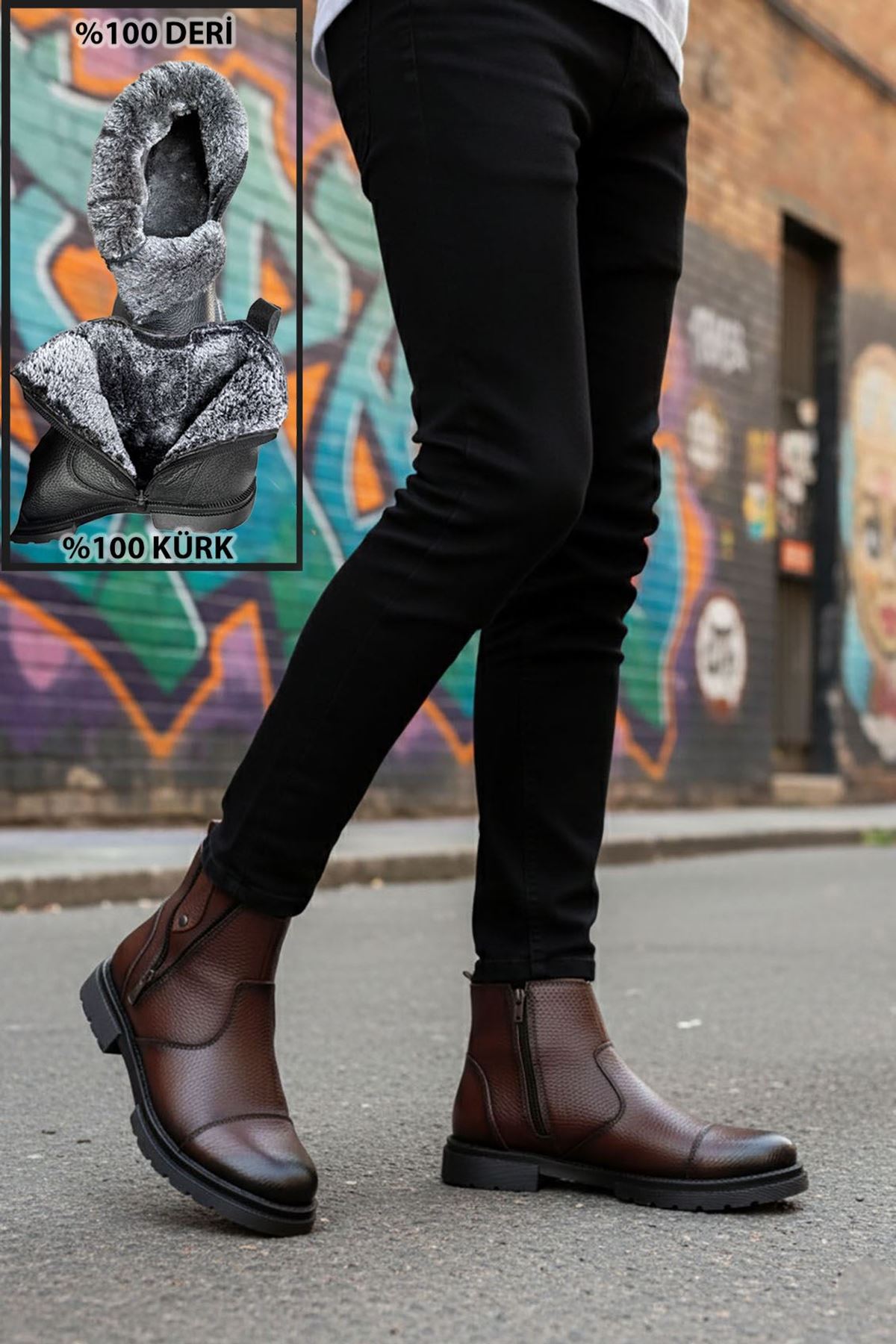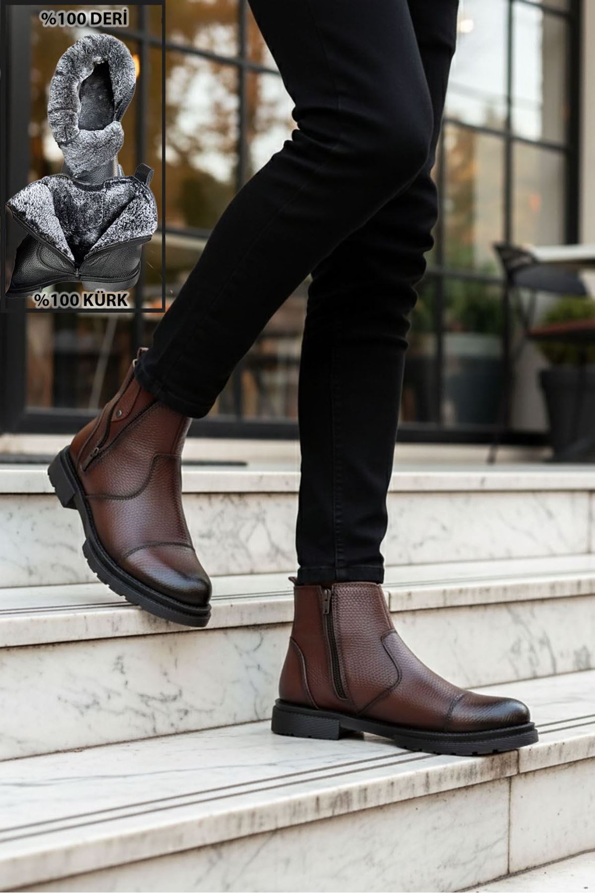 Boy Uzatan Gizli Topuk Kahve İçi Kürklü Fermuarlı Chelsea Hakiki Deri Erkek Bot